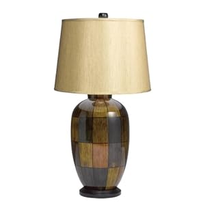 A wonderful color block design in earth tones decorates the hand-painted porcelain base of this table lamp. An round hardback shade in light caramel tops this intriguing design. Rich earth tones and smooth lines make this a charming lighting choice. Three-way socket offers more lighting control.