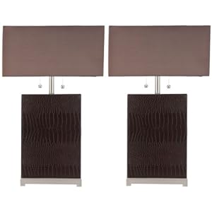 Add a fresh accent to your home with the Safavieh Lighting Collection Hilary Brown Faux Leather Table Lamps. The brown faux aligator bicast leather base is accented by the brushed nickel accents. This lamp features a two-bulb design, and decrative pull chain switches. A chocolate-colored silk shade completes the look. These lamps are UL approved.