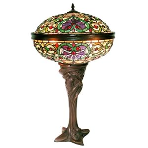 This beautiful Barquare table lamp has been handcrafted using methods first developed by Louis Comfort Tiffany. Shade contains pieces of stained glass, each hand-cut and wrapped in fine copper foil. Dome shade in hues of green, blue, ivory, and amber. Highlighted by red jewel accents. Ornate lady motif metal base. Requires two 60-watt bulbs (not included). Measures 28 inches high x 17 inches in diameter at base. Note: Shade colors will appear darker and less vibrant when not illuminated.